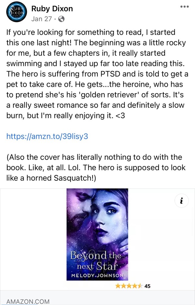 Seriously a dream come true! The Queen of alien romance herself, Ruby Dixon, recommended Beyond the Next Star to her followers. PINCH ME!!