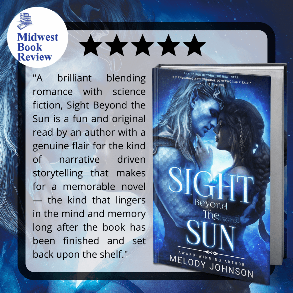 Midwest Book Review has described my writing as “brilliant” and I can’t stop pinching myself! “A brilliant blending romance with science fiction, “Sight Beyond the Sun” by author Melody Johnson is a fun and original read by an author with a genuine flair for the kind of narrative driven storytelling that makes for a memorable novel — the kind that lingers in the mind and memory long after the book has been finished and set back upon the shelf.” Check out the full review!