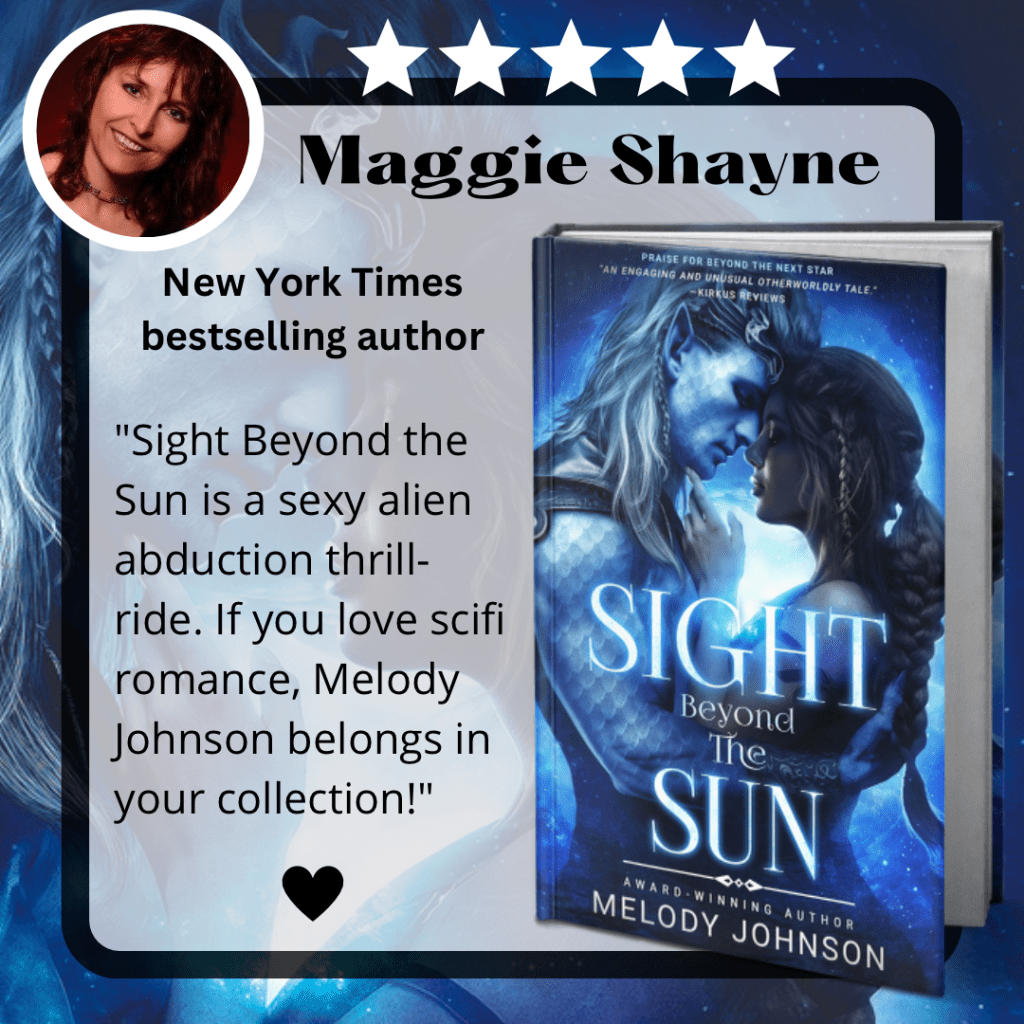 Doing a happy dance!! New York Times bestselling author, Maggie Shayne says… “Sight Beyond the Sun is a sexy alien abduction thrill-ride. If you love sci-fi romance, Melody Johnson belongs in your collection!” Eeeek! I was OBSESSED with Maggie Shayne’s Thicker Than Water series in high school. My friends and I would pass her books back and forth to one another, and not only did Thicker Than Water zip through our reading circle like lightening, it’s the only book I ever finished and then went straight back to page 1 to immediately read it a second time – it was that good. It’s mind blowing to me that after all these years of looking up to her, now she likes my book. Thank you, Maggie, for being such an influential author and inspiration in my writing life.