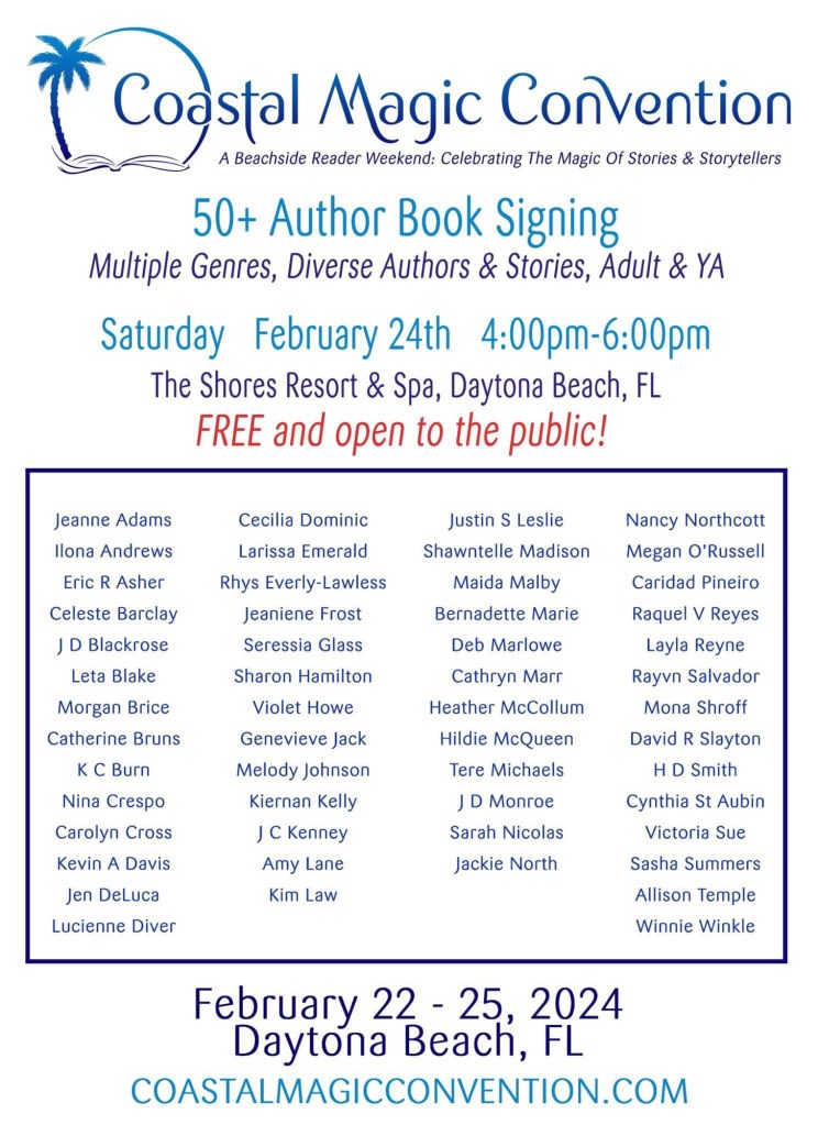 Looking for exciting plans this weekend? Join me at Coastal Magic Convention this Saturday at 4pm for a fantastic book signing, featuring Ilona Andrews, Jeaniene Frost, Hildie McQueen, J.D. Monroe, and more… including me!!