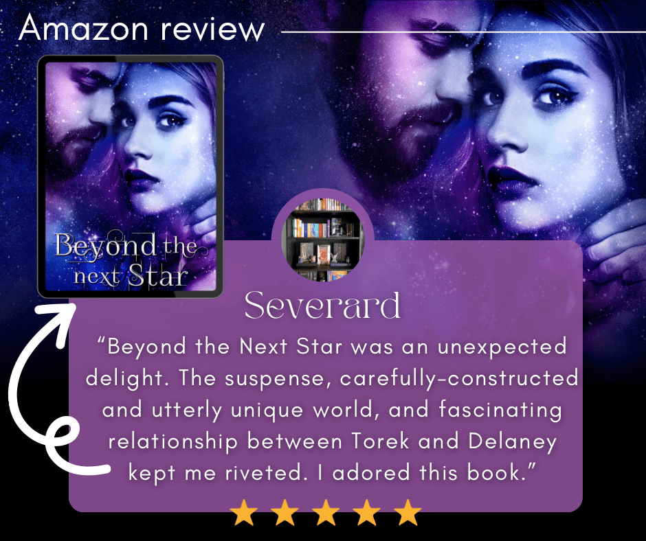 This 5-star Amazon review was posted by a reader I met while on tour at one of my reader conventions. It still tickles me to remember meeting this lovely woman and how much she connected with Beyond the Next Star. “This book was an unexpected delight. The suspense, carefully-constructed and utterly unique world, and fascinating relationship between Torek and Delaney kept me riveted. I found Johnson’s approach to the alien-human genre to be refreshing and wildly emotional as both characters fought to gain understanding of the situation they found themselves in. I adored this book.”