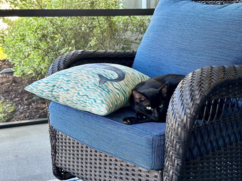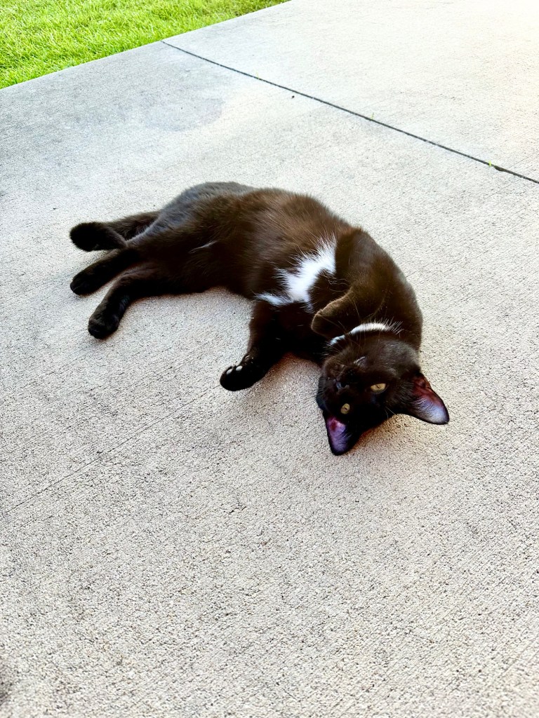 Meet Mischief! A friendly neighborhood cat, this little dude has been visiting me every evening for several weeks, becoming a welcome distraction during the time I usually devote to social media posting after my daily writing walk. He’s so sweet, begging for treats and attention – I’m a sucker for needy fur babies and ripe for a reason to be distracted.