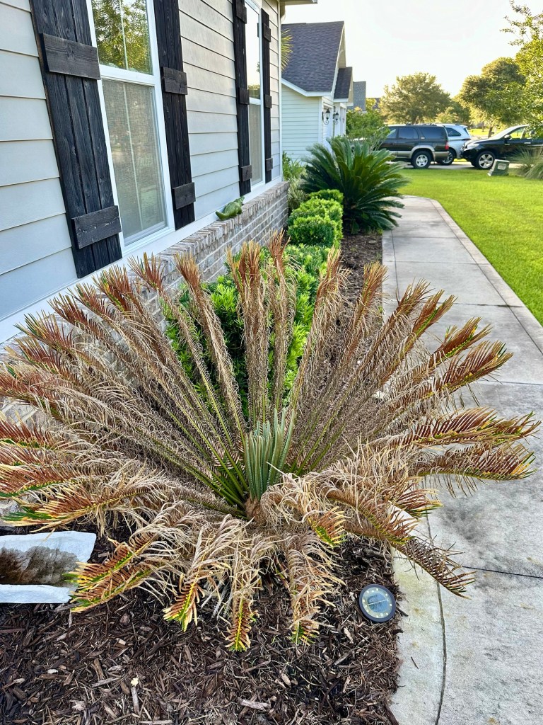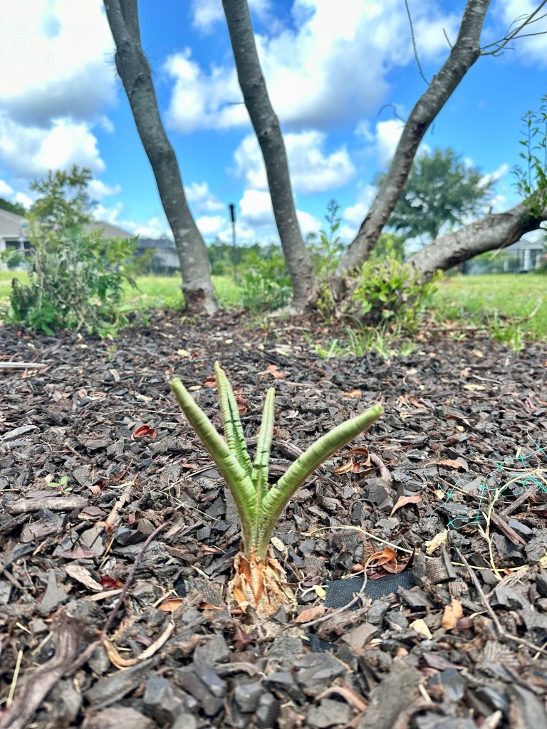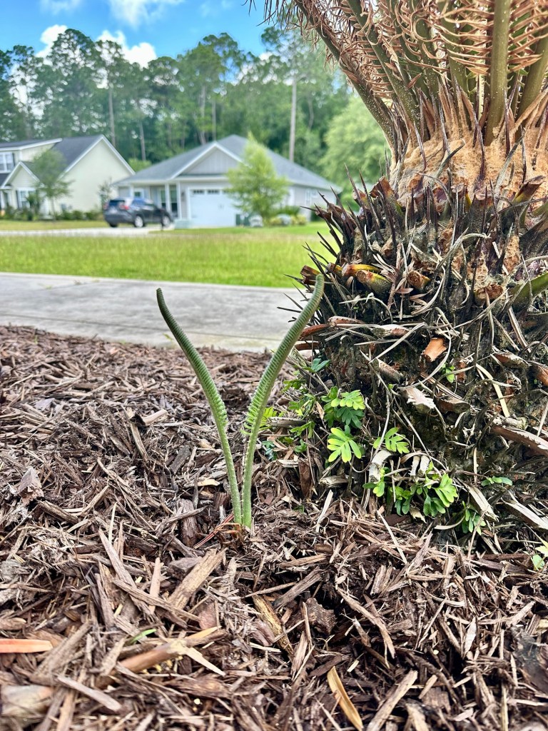 My Sago Palm Saga continues! The bush on the east end of my house looked completely dead even after having given birth to a pup this spring. But I returned from PA to new growth! Fingers crossed, the leaves will continue to unfurl into lush greenery. Send all your good vibes and green thumbs, please!!
