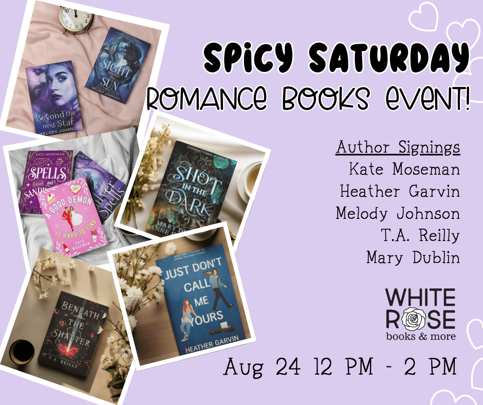 I’m thrilled to announce that I’ll be a signing author at White Rose books & more in Kissimmee, FL, for their Spicy Saturday Signing on Aug. 24, 12-2pm! In addition to myself, authors include Kate Moseman, Heather Garvin, T.A. Reilly, and Mary Dublin. The event is free, but books must be purchased at the bookstore. Pre-order your book today!