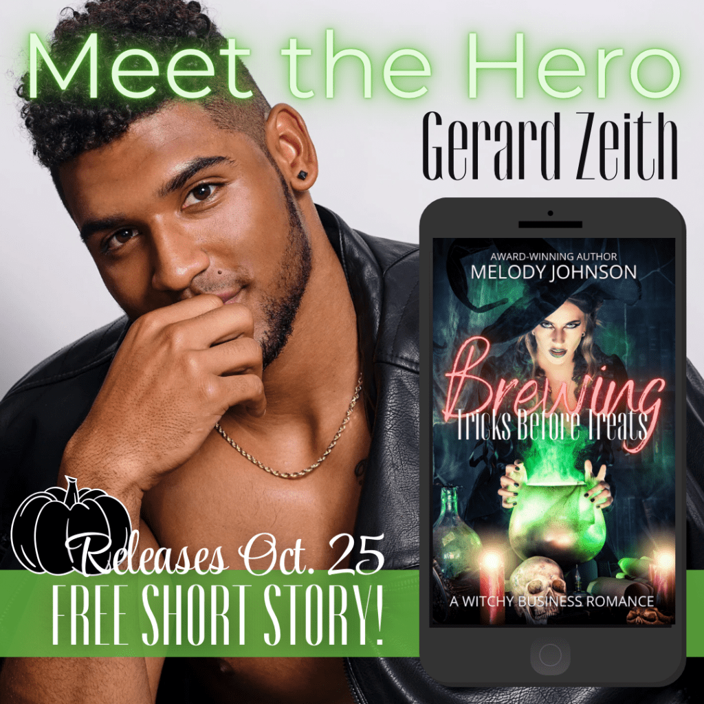 Meet Gerard Zeith, the hero of Brewing Tricks Before Treats! As the Harbinger for the East Thornton Coven Counsel, Gerard is tasked with investigating Petra’s Pots & Potions. If Petra willingly sells him a poison brewed with death magic, he’ll finally have evidence to clinch his case against the Maine family and bring Petra to justice. Gerard isn’t Petra’s only patron with underhanded motives… but he’s certainly the most delicious.