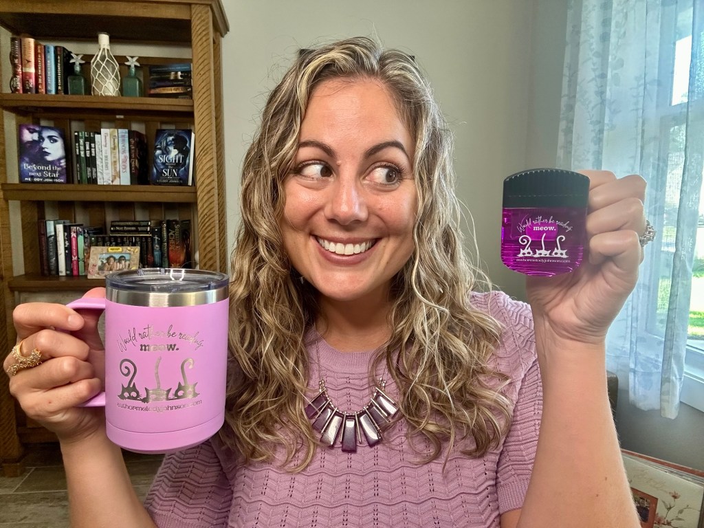 Swag for Space Coast Book Lovers has arrived!! This year I’m doing a “Would rather be reading meow” tagline inspired by Mischief. Purple mugs and magnetic chip clips match The City Beneath and are pet-themed for Beyond the Next Star. T-minus 4 weeks until Space Coast! 💜💜💜